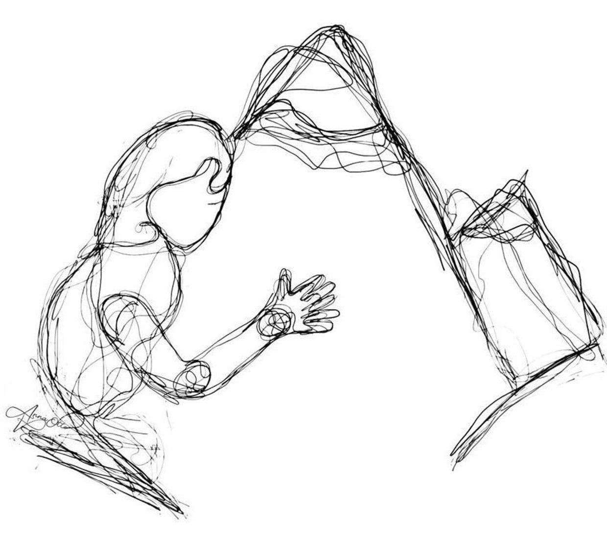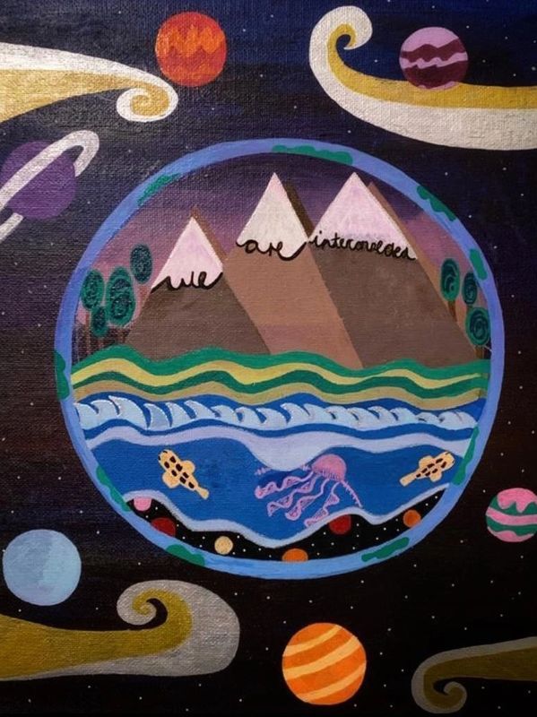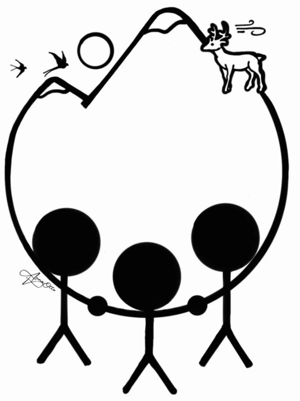 Artwork description: the woman shape has many different shapes within her to represent a collectivity of beings, she represents the Earth and is drawn with one same line with the mountains.
